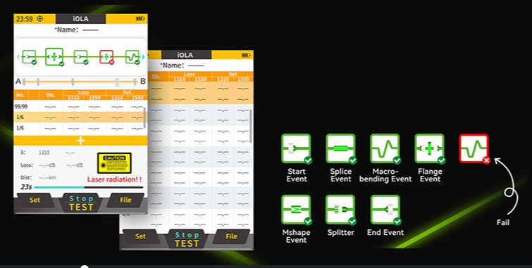 The iOLA function is designed to quickly detect every event along a fiber line. It instantly displays attenuation loss and, with the help of AI technology, identifies specific issues such as cable bends or splicing points. This smart detection allows technicians to quickly locate the source of a weak signal, making troubleshooting faster and more accurate.
